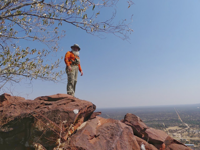 Events up until now included a stay near Waterberg National Park, a huge plateau rising up out of the plains. We took the time there to 1. Climb little Waterberg (the adjacent plateau, behind our guest house. Only Jim and I. The guest house dogs accompanied us to the top, which the owner says they sometimes to twice in a day. A heroic feat for the elderly Jack Russell terrier, who was panting to hard Jim shared his water. It felt like you could see all the way across Namibia from up there. Looking at the pic where Jim is on the rock, you can see the road across the owner’s land which we took that afternoon to the CCF: the Cheetah Conservation Fund.